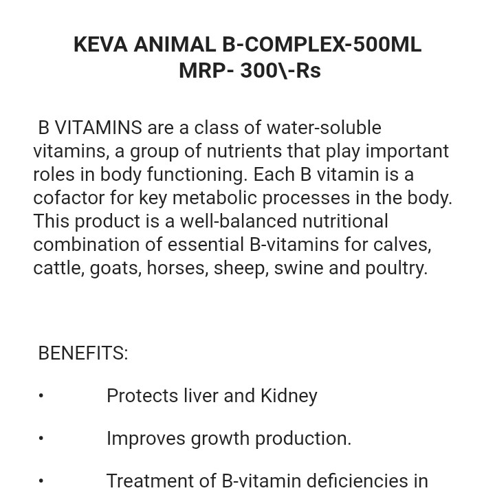 Boost your livestock’s health with KEVA Animal B Complex 500ml, a premium multivitamin supplement designed for cows, buffaloes, goats, and other farm animals. Formulated with essential B vitamins and nutrients, it supports energy metabolism, growth, immunity, and overall well-being.