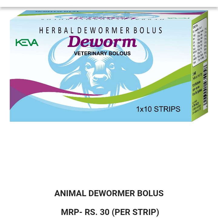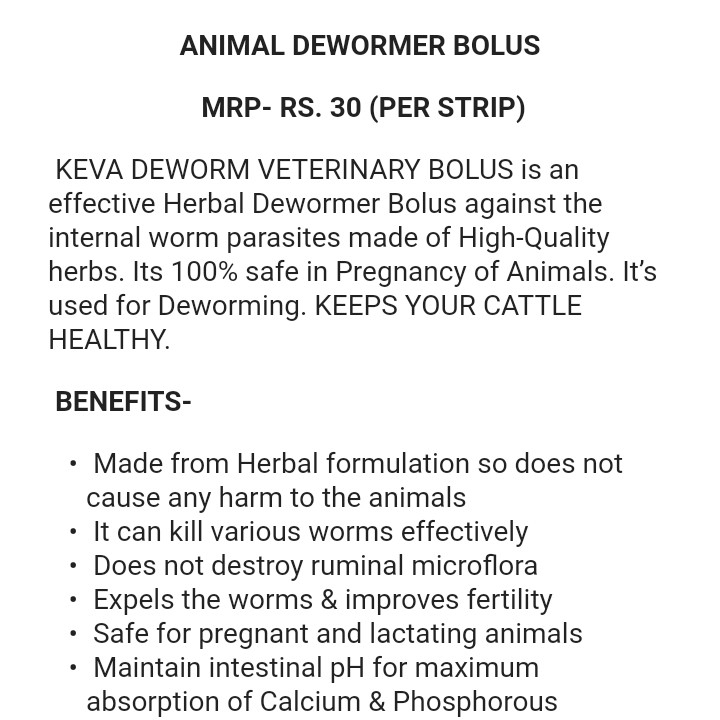 KEVA Animal Deworm Bolus helps remove internal parasites and improves digestion and growth. Ideal for cows, buffaloes, goats, and sheep for better health and productivity.
