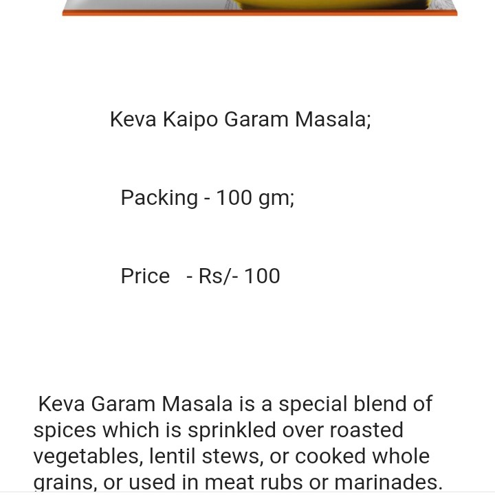 KEVA Garam Masala 100 GM is a premium blend of carefully selected spices to give your dishes a rich, authentic flavor. Made from fresh and natural ingredients, it adds warmth, aroma, and depth to curries, gravies, snacks, and traditional Indian recipes.