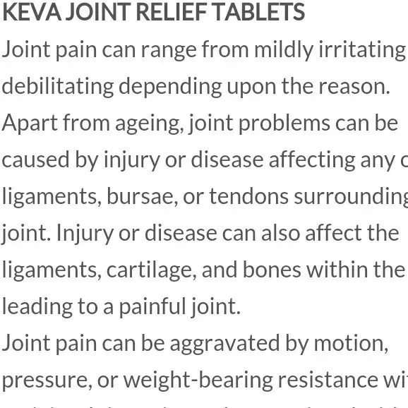 KEVA Joint Relief Tablets are formulated with herbal ingredients traditionally used to reduce joint pain, inflammation, and stiffness. Aging, stress, and lifestyle factors can affect joint health and mobility.