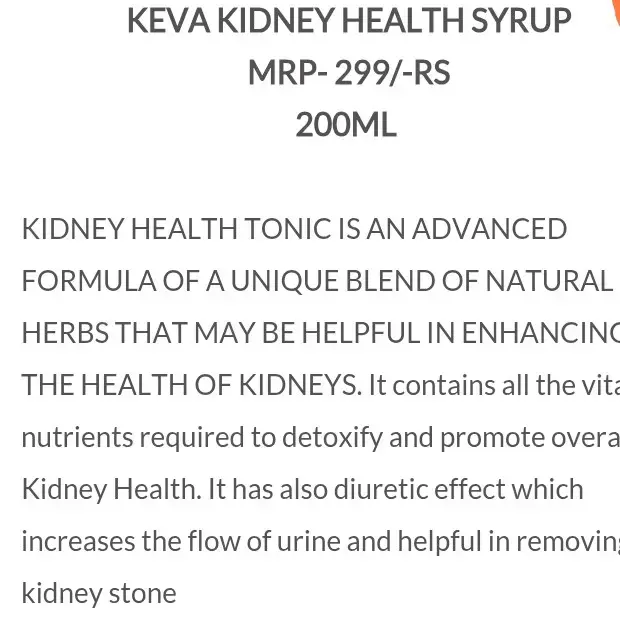 KEVA Kidney Health Syrup 200ml is a herbal formulation designed to support kidney function, detoxify the urinary system, and maintain overall renal health. Regular use helps improve kidney efficiency, supports toxin elimination, and promotes general wellness naturally.