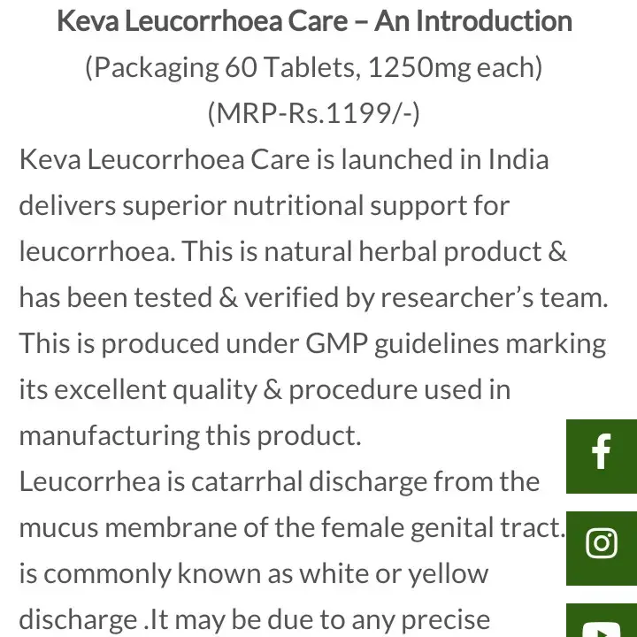 KEVA Leucorrhea Care Tablets are formulated with herbal ingredients traditionally used to support women’s intimate and vaginal health. Excessive white discharge (leucorrhea) may be associated with weakness, irritation, odor, or discomfort if not managed properly.