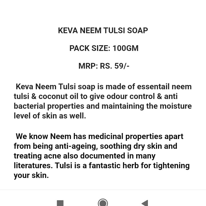KEVA Neem Tulsi Soap 100g is crafted with the natural goodness of Neem and Tulsi to provide gentle yet effective cleansing. It helps remove dirt and impurities while keeping the skin fresh and comfortable.